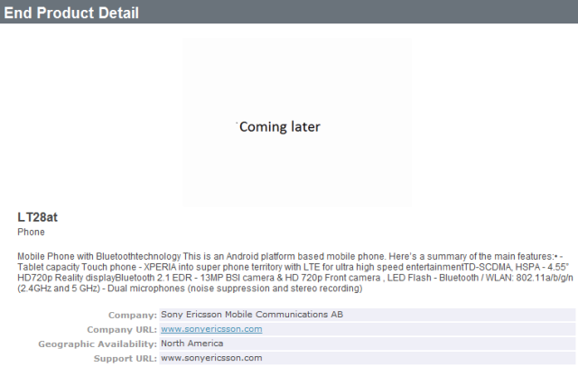 นอกจากรูปตัวอย่างเครื่อง Sony Ericsson Xperia Arc HD ที่อยู่ในรหัสการพัฒนาว่า Nozomi ที่มีข้อมูลว่าจะเปิดตัวที่งาน CES ในเดือนมกราคมปีหน้านี้ ก็มีข้อมูลของ Xperia ตัวใหม่อีกตัวหนึ่งที่ไม่เคยเห็นมาก่อน เเต่มีสเปคทื่ใกล้เคียงกับ Xperia Arc HD มาก จึงเป็นไปได้สูงว่าจะเป็น Xperia Arc HD ในเวอร์ชันที่วางขายในสหรัฐนั่นเอง โดยมีหน้าจอขนาด 4.55 นิ้ว หน้าจอความละเอียด 1280 x 720 มีกล้องความละเอียด 13 ล้านพิกเซล กล้องหน้าความละเอียด 720p เเละสนับสนุนเครือข่าย 4G LTE