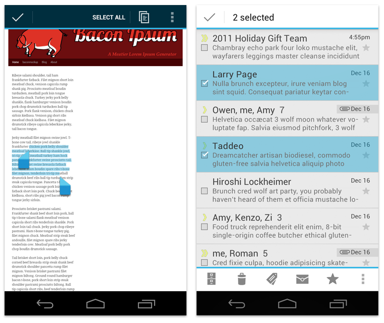 Action Bar นั้นเหมือนกับการรวมคำสั่งที่จำเป็นเเละใช้งานบ่อยๆ ซึ่งเป็นการลดกระบวนการเรียกคำสั่งลง 1 ขั้นที่ต้องกดปุ่มเมนูขึ้นมาก่อน เเละมีปุ่ม Action Overflow ไว้สำหรับเก็บคำสั่งที่ไม่ได้ใช้งานบ่อยเพื่อให้เเอพดูเเล้วสะอาดตาเเละเป็นระเบียบมากขึ้น ส่วนเเอพที่ใช้ Action Bar ชุดเเรกนั้นก็คือเเอพที่ติดมากับ Ice Cream Sandwich เช่น Gmail, Calendar หรือ Youtube อย่างเช่น Gmail จะมีคำสั่งต่างๆ อยู่ที่บริเวณด้านล่างเเละด้านบนของเเอพดังตัวอย่างด้านล่าง