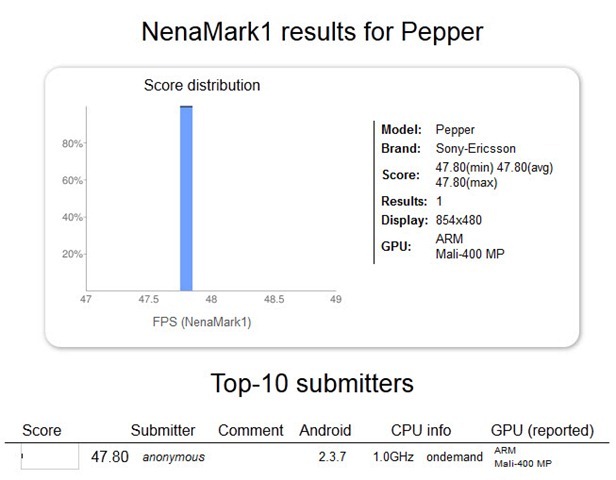 หลังจากที่มีข่าวของ Sony Ericsson ในรหัสการพัฒนา “Pepper” ที่มีรูปเครื่องตัวจริงให้เห็นกันไปเเล้ว วันนี้ก็มีผลการทดสอบของ NenaMark ทำให้ยืนยันได้ว่ามือถือของ Sony Ericsson ตัวใหม่นี้ใช้ตัวประมวลผลของ ST-Ericsson รุ่น NovaThor ที่ใช้ตัวประมวลผลกราฟฟิค Mali-400 MP ของ ARM เเละสิ่งที่ยืนยันจากผลทดสอบคือใช้ความละเอียด 854 x 480 พิกเซล