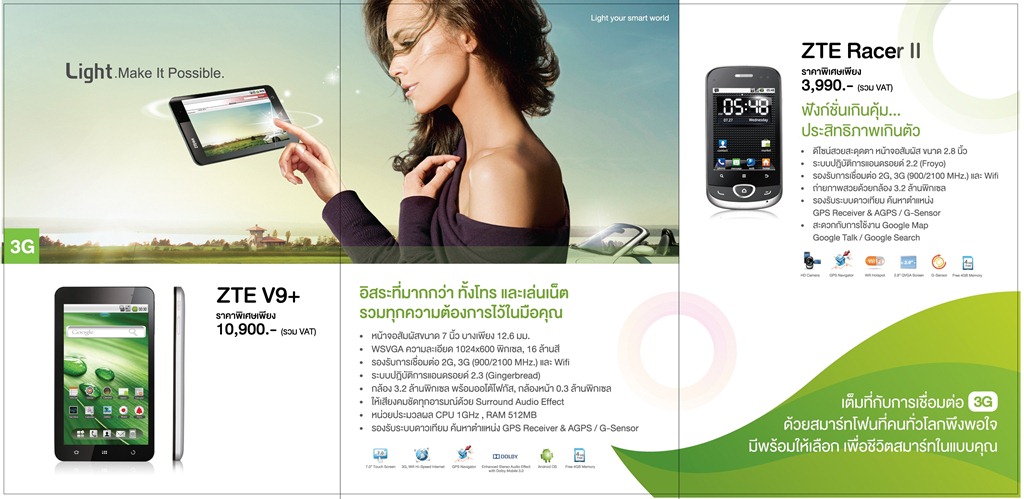 · ZTE Racer II สมาร์ทโฟนแอนดรอยด์ขนาดเล็ก พร้อมฟังก์ชั่นการใช้งานครบ ในราคาสุดคุ้ม เพียง 3,990 บาท ( พิเศษ! ลูกค้าเอไอเอสเมื่อสมัครแพ็กเสริม 129 บาท รับสิทธิ์โทรเดือนละ 100 นาที และใช้งาน AIS 3G/EDGE+ เดือนละ 100 บาท นาน 6 เดือนสมัครโทร *212352 ตั้งแต่วันนี้ – 31 มี.ค. 55 )